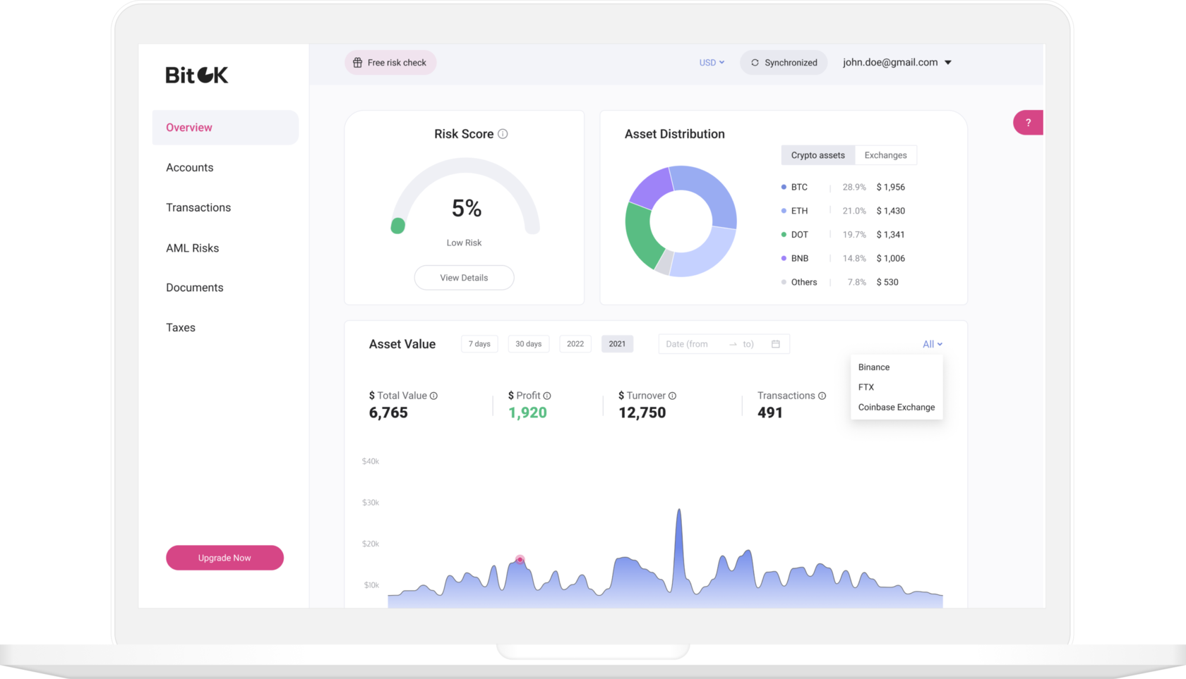 We have enhanced your cryptocurrency experience by revamping our dashboard design. Retained sections include: AML Risk, Asset Distribution, Asset Value, Recent Transactions.